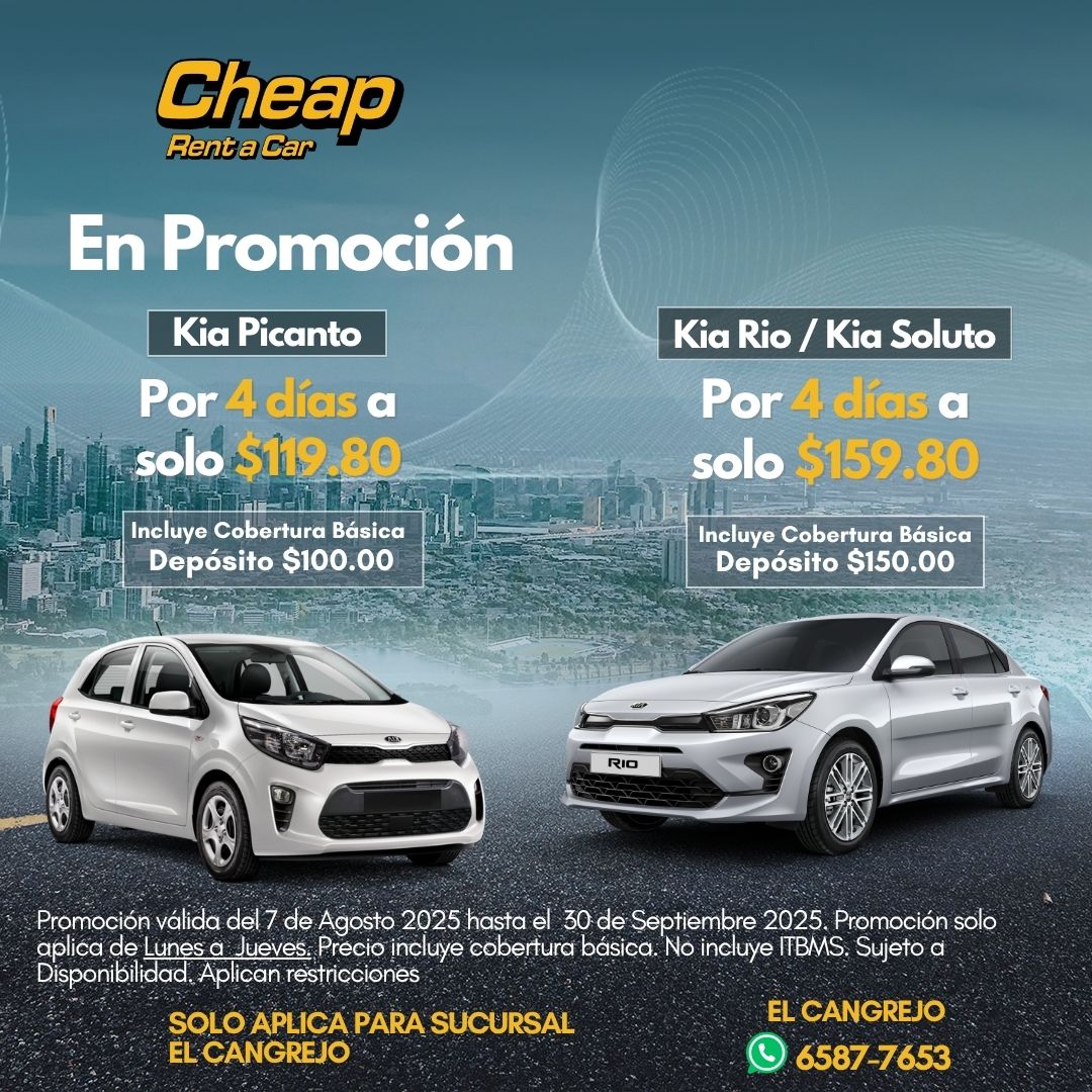 Aprovecha las mejores promociones de alquiler de autos en Panamá con Cheap Rent a Car. Ofertas especiales en vehículos económicos y SUV, disponibles en nuestras sucursales de El Cangrejo y La Chorrera. ¡Reserva ahora y conduce más por menos!”