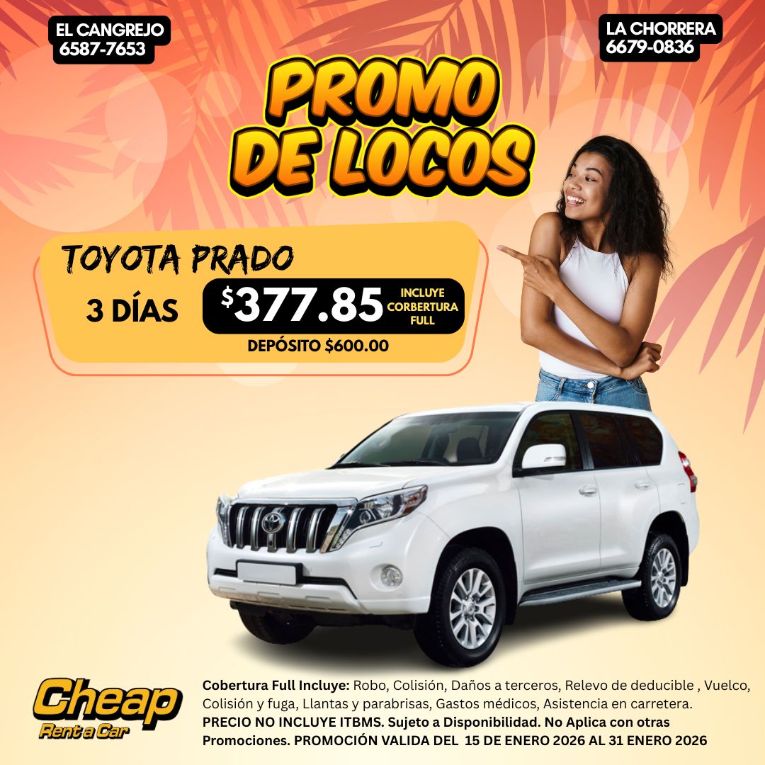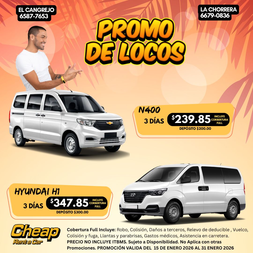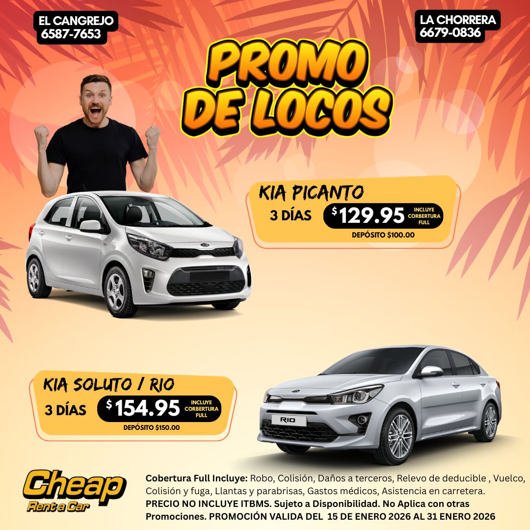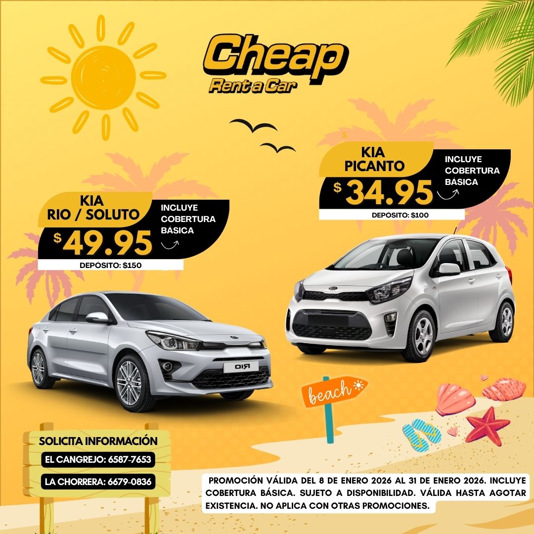 Aprovecha las mejores promociones de alquiler de autos en Panamá con Cheap Rent a Car. Ofertas especiales en vehículos económicos y SUV, disponibles en nuestras sucursales de El Cangrejo y La Chorrera. ¡Reserva ahora y conduce más por menos!”